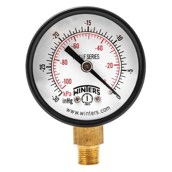 Lead-Free Vacuum Gauge, Nominal Dial Size 2 in, Accuracy +/-3-2-3 Percent, Gauge Case Material Steel, Process Connection Type NPT, Process Connection Gender Male, Lens Material Plastic, Process Connection Size 1/8 in, Field Fillable No, Process Connection Location Bottom, Case Color Black, IP/NEMA Rating IP52, Primary Pressure Range 30 to 0, Dry Dampening Feature None, Vibration Resistance None, Dial Color White, Pressure Gauge Type Lead-Free Pressure Gauge, Liquid-Filled Case No