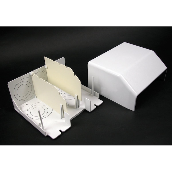 Entrance End Fitting, Series 5500, For Raceway Width x Height 6 11/16 in x 1 3/4 in, Material Non-Metallic, Color Ivory, Number of Channels Multiple, Compatible with Product Type 5500 Raceways, Features Removable Dividers Are Included, For Feeding Raceway From Larger Conduits, Has Concentric 3/4 in, 1 in, 1 1/2 in and 2 in Trade Size Knockouts on End and Back, Includes Removable Dividers, Overall Height 3 1/4 in, Overall Length 7 in, Overall Width 5 3/4 in, Standards cUL Listed, UL Listed