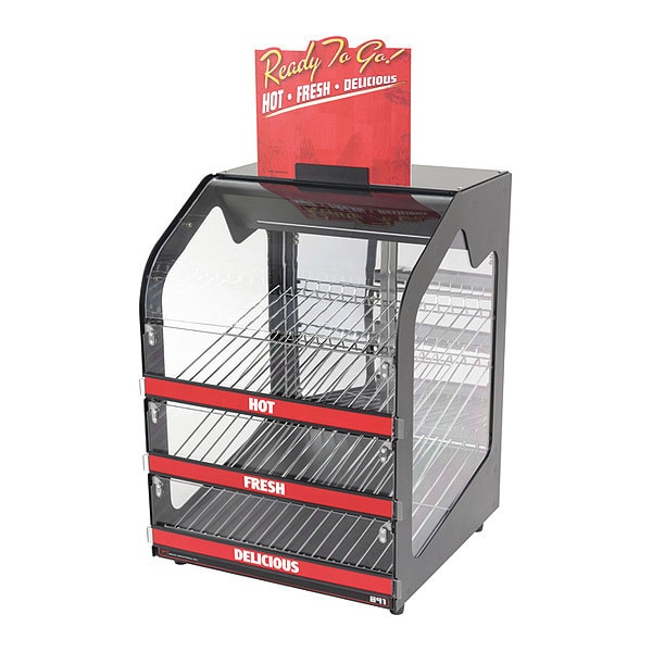 Digitally Controlled Heated Display Merchandiser, Number of Shelves 3, Overall Height 22 3/8 in, Overall Width 15 1/2 in, Overall Depth 17 1/8 in, Color Black, Red, Current 5.6 A, Voltage 120V AC, Wattage 670 W, For Use With Burritos, Cookies, Pizza, Sandwiches, Features Racks, Adjustable Digital Temperature Control, Double Rear Doors, Heated, Forced Air, Overhead and Rear LED Illumination