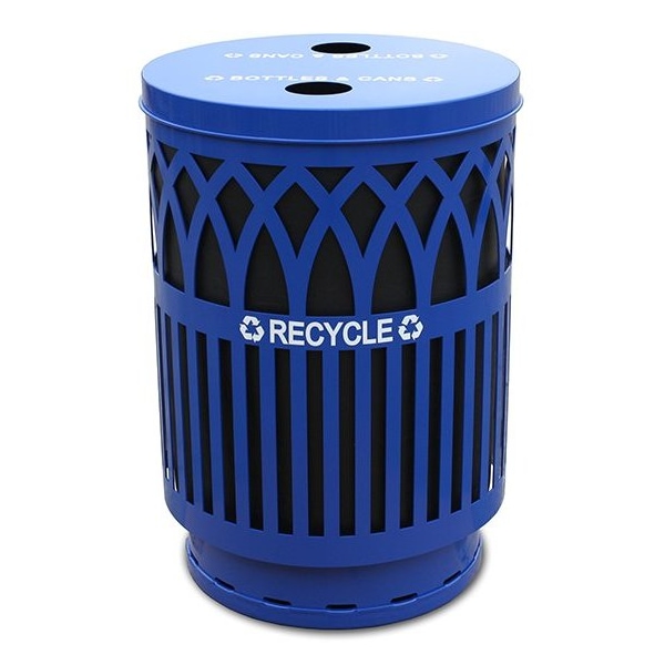 Decorative recycling receptacle with a sleek, laser cut, contemporary design. Comes with a flat top lid with 2 round openings for recycling of cans and bottles. Perfect for city streets, open-air malls, universities, parks, office complexes and many other environments. Made of heavy gauge galvanneal steel with a powder coat finish for added durability. A protective coated base helps to eliminate paint chipping and rust rings. Comes standard with a rigid plastic liner, leveling feet, lid attachment kit and anchor kit. Recycle decal and lid opening decals included