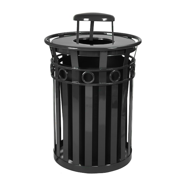 Outdoor metal waste receptacle made of durable flat bar steel. The decorative ring at top adds style to durability and the black powder coat finish adds a layer of protection from the elements. This receptacle has a rain cap with a center opening that makes disposing of trash easy and keeping the weather out. It also comes standard with leveling feet, plastic liner, lid attachment kit and anchor kit.