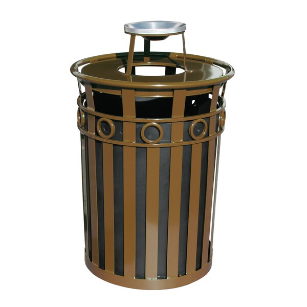 Outdoor metal waste receptacle made of durable flat bar steel. The decorative ring at top adds style to durability and the brown powder coat finish adds a layer of protection from the elements. This receptacle has an ash pan attached to the standard flat top that allows for disposal of waste as well as cigarette butt by-products. It also comes standard with leveling feet, plastic liner, lid attachment kit and anchor kit.