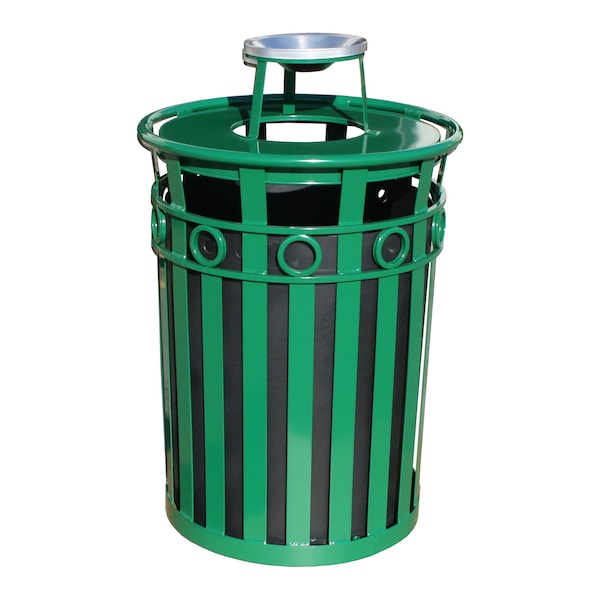 Outdoor metal waste receptacle made of durable flat bar steel. The decorative ring at top adds style to durability and the green powder coat finish adds a layer of protection from the elements. This receptacle has an ash pan attached to the standard flat top that allows for disposal of waste as well as cigarette butt by-products. It also comes standard with leveling feet, plastic liner, lid attachment kit and anchor kit.