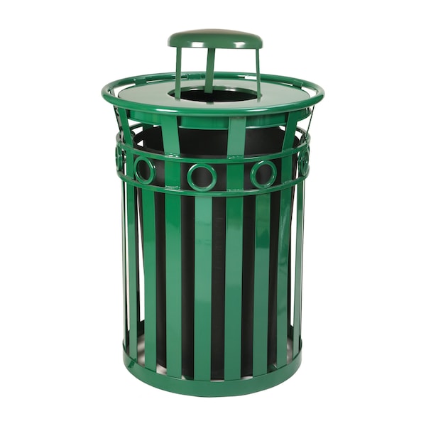 Outdoor metal waste receptacle made of durable flat bar steel. The decorative ring at top adds style to durability and the green powder coat finish adds a layer of protection from the elements. This receptacle has a rain cap with a center opening that makes disposing of trash easy and keeping the weather out. It also comes standard with leveling feet, plastic liner, lid attachment kit and anchor kit.