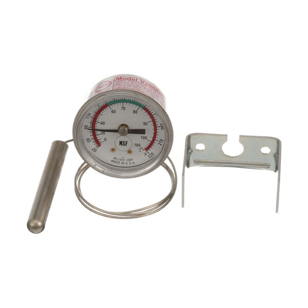 Temperature Gauge, 20-220 F, Green Range 140-180 F,;Red Range (20-140 F & 180-220 F,) Dial 2" Dia, Cap 24", ;Nickel Bulb .425" X 2.5", Rear "U" Clamp W/ 3/8" Hex Nut,;Wittco Warmer