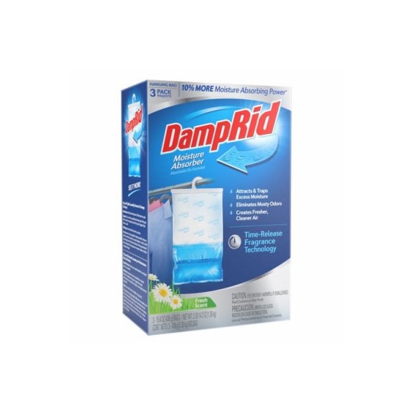 Damp Rid, 3 Pack, 154 OZ, Closet Freshener, Fresh Scent Moisture Absorber 10 more moisture absorbing power for longer lasting moisture absorption Attracts traps excess moisture, eliminates musty odors, creates fresher, cleaner air Time release fragrance technology works continuously during the full life of the product NonToxic