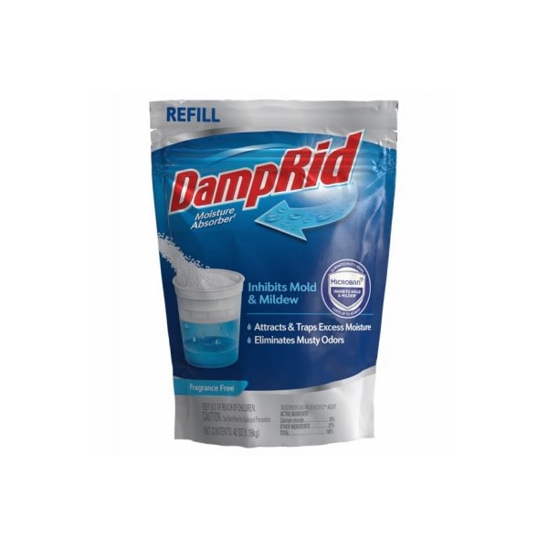 Damp Rid, 42 oz Refillable Fragrance Free Moisture Absorber with Micro Ban Inhibits mold, mildew, attracts, traps excessive moisture, eliminates musty odors by drying the air to a level where mildew, mold can't grow Odorless, Non Toxic, can be refilled, reused