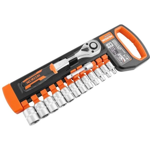 This Wokin 14 pieces 1/4 inch ratchet handle with sockets set is precision-crafted for reliability and durability. It features a 72T quick release ratchet handle, 12 metric Cr-V sockets 4-14mm, one 50mm extension bar, and all the same quality features as Stanley. The set is ideal for a wide range of projects from automotive repairs to general projects.