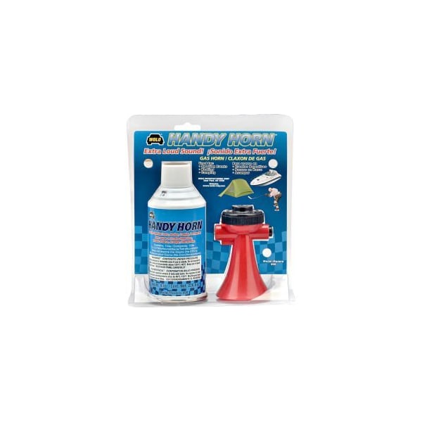 HAND HELD GAS HORN WITH A WOLO'S EXCLUSIVE PATENTED DESIGN. THE TRUMPET HORN IS MADE OF DURABLE RED PLASTIC TO WITHSTAND ANY ENVIRONMENT AND IS IDEAL FOR MARINE, SPORTING EVENTS, CAMPING, ROAD EMERGENCIES, ETC. COMES COMPLETE WITH 8 OZ. CAN OF ENVIRONMENTALLY SAFE R152A GAS (NO CFC'S). WHEN A REFILL CAN OF GAS IS NEEDED, USE MODEL 495 HANDY HORN REFILL. ALWAYS USE PROPER AIR PROTECTION WHEN SOUNDING HORN. PATENTED: US D586,195, US 8,0004,39, AND US 8,149,097 SPECIFICATIONS: