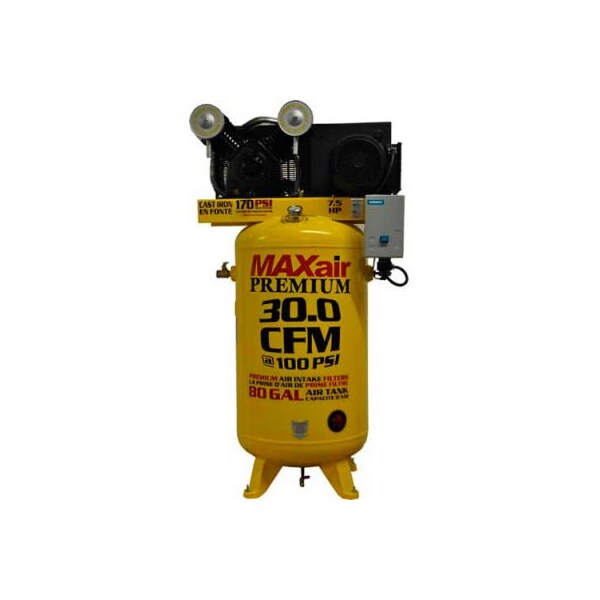MaxAir, 7.5 HP, Single-Stage Comp, 80 Gal, Vert., 170 PSI, 30 CFM, 1-Phase 208-230V