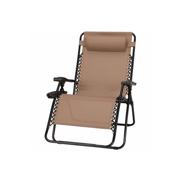 Four Seasons Courtyard Sunny Isles extralarge mocha tan steel zero gravity chair with double bungee cord stability Black frame and mocha tan polyester sling fabric Ring lock mechanism for easy recline and detachable tray for holding drinks, phones and more Open dimensions 3543 in D x 307 in W x 437 in H Weight capacity 350 lb