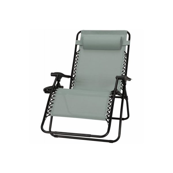 Four Seasons Courtyard Sunny Isles extralarge seafoam green steel zero gravity chair with double bungee cord stability Black frame and seafoam green polyester sling fabric Ring lock mechanism for easy recline and detachable tray for holding drinks, phones and more Open dimensions 3543 in D x 307 in W x 437 in H Weight capacity 350 lb