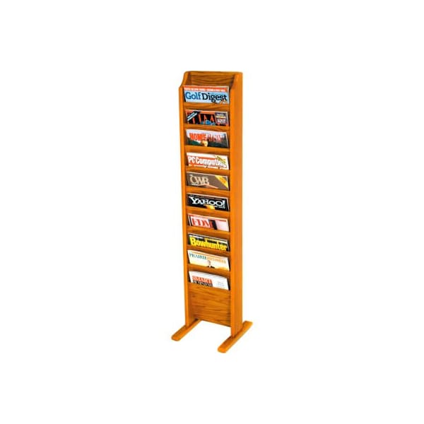Oak literature organizers 10 pocket free standing oak display attractive literature organizers neatly display and organize printed materials. " thick solid oak frame with laminated oak panels. Oak front pockets measure 9"w x "d to hold 8-1/2" x 11" literature. Easily assembled.