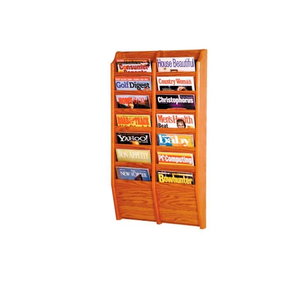 Oak literature organizers 14 pocket oak wall rack attractive literature organizers neatly display and organize printed materials. " thick solid oak frame with laminated oak panels. Oak front pockets measure 9"w x "d to hold 8-1/2" x 11" literature. Predrilled and include hardware for easy installation.