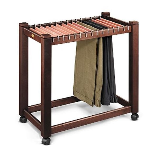 Keep your finest slacks neatly organized with this Woodlore Pant Trolley With Cedar Hang Bars. The elegantly finished pants organizer will conveniently hold up to 15 pair of trousers making this a perfect addition to your closet. The natural cedar hanging rods are removable and will keep your pants wrinkle free. The natural aromatic cedar scent will keep your closet smelling fresh and will help to repel moths and other insects as the cedar absorbs excess moisture. You can place the trolley organizer underneath your hanging clothes giving you more closet hang bar space in your closet or will look and fit nicely in any bedroom dTcor. Frame of trolley is constructed of solid wood and 4 rolling casters are featured with this functional storage product for easy movability. Dimensions are 29 inches W x 26.75 inches H x 16.9 inches D.