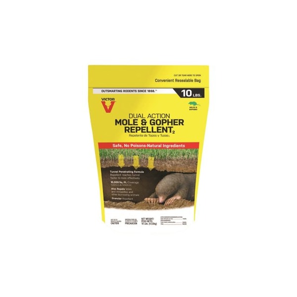 Victor 10 LB Mole & Gopher Granular Repellent Repels Moles Gophers Voles Armadillos & Other Burrowing Animals Dual Action Repels By Scent & Taste Concentrated Tunnel Penetrating Formula Provides 10000 SQFT Of Coverage.