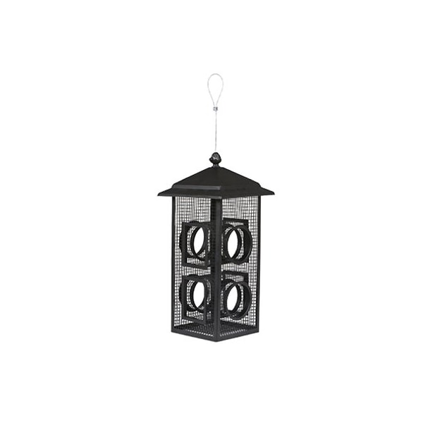 Perky-Pet Black Fly Through Wild Bird Feeder. It is a metal mesh with 2 fly through stations. It encourages many birds to visit your backyard. It has 2 feeders in 1 for birds to rest as well as feed. All 4 sides are mesh making bird watching easier & more enjoyable. It has 2 lb. seed capacity.