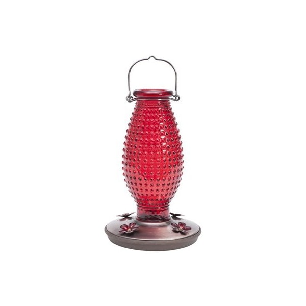 Perky-Pet 16 oz. Capacity Red Hobnail Vintage Hummingbird Feeder. It is a vintage hobnail glass bottle with red luster finish. It has wide mouth opening for easy filling and cleaning. It has 4 flower feeding ports. It is for attracting and feeding hummingbirds. It comes with 30 Day Replacement Warranty.