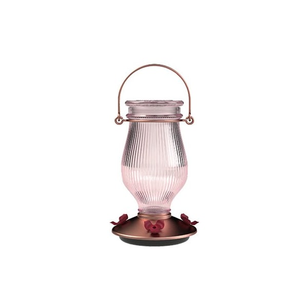 Perky-Pet 24 oz. Sun Kissed Top Fill Hummingbird Feeder. It is a glass hummingbird feeder with 5 perches. It is top fill for easy filling and leak free. It has easy to clean base and removable bee proof ports. It is suitable for hummingbirds. It comes with 90-day warranty.