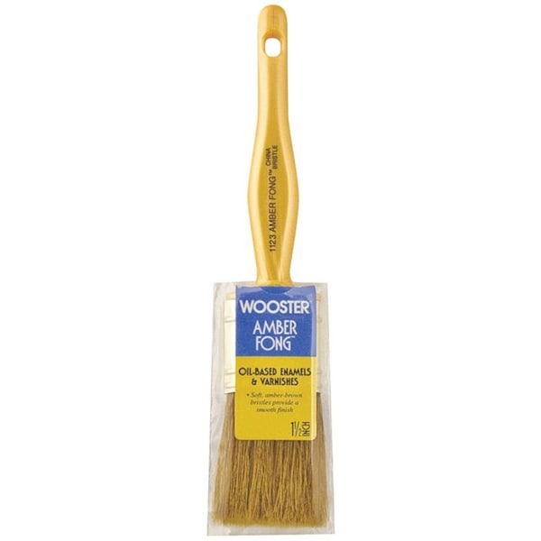 Soft, amber-brown bristles provide a smooth finish with all oil-based enamels, varnishes, and stains. Brown China bristle, chisel trim. Brass-plated steel ferrule. Pearl-yellow solid plastic Kaiser handle