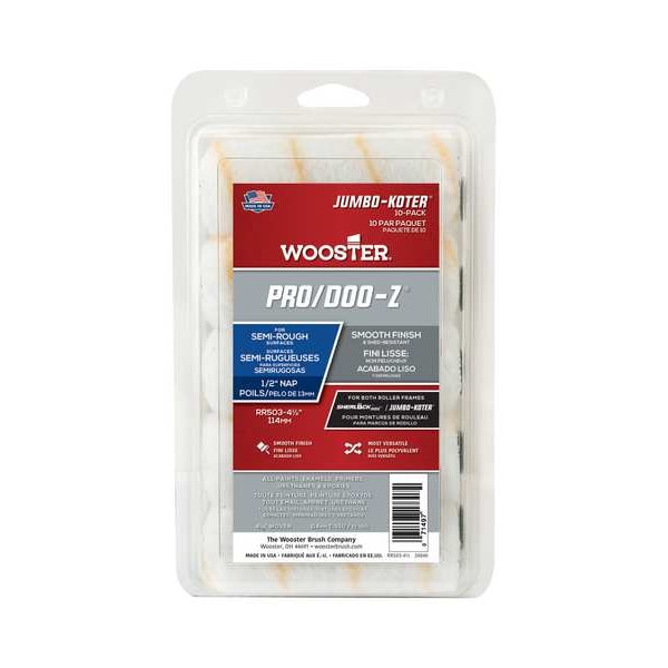 Mini Paint Roller Cover, Cover Type Standard, Surface Texture Semi-Rough, Compatible Roller Frame Style Cage, 4 1/2 in Overall Length, 1/2 in Nap Size, Surface Material Brick, Concrete, Drywall, Masonry, Metal, Wood, Paint Type Adhesives, All Paints, Enamels, Primers, Core Diameter 3/4 in, Cover Material Woven Fabric, Core Material Polypropylene, For Use With Jumbo-Koter Cage Frames, Sheen Type High Gloss, Package Quantity 10
