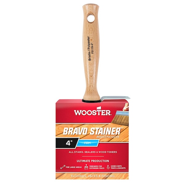 Bravo Stainer professional quality block stain brush features a blend of White China bristle and polyester. Threaded hardwood handle removes for extension pole use. A great option for painting or staining flooring and hard-to-reach areas. The bucket clip reduces mess. Recommended for exterior surfaces.