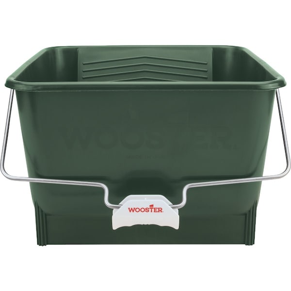 Built-in 10 In. wide roll off area no-tip design and extra-strong 1/4 In. galvanized bail with comfort-grip. Durable green polypropylene resists solvents and paint buildup.