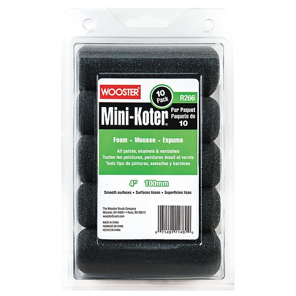 Mini Paint Rollers, Cover Type Mini, Surface Texture Smooth, Compatible Roller Frame Style Wire, 4 in Overall Length, 0 in Nap Size, Surface Material Drywall, Metal, Wood, Paint Type All Paints, Enamels, Varnishes, Core Diameter 1/4 in, Cover Material Foam, Package Quantity 10