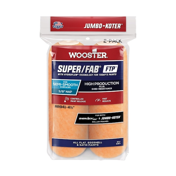 Jumbo-Koter Super/Fab FTP 2 Pack 4 x 3/8 Larger Colored High Capacity Roller Cover Shed Resistant Fabric Hydro Flow Technology Offers Controlled Paint Release Use With All Flat Eggshell Satin Paints.