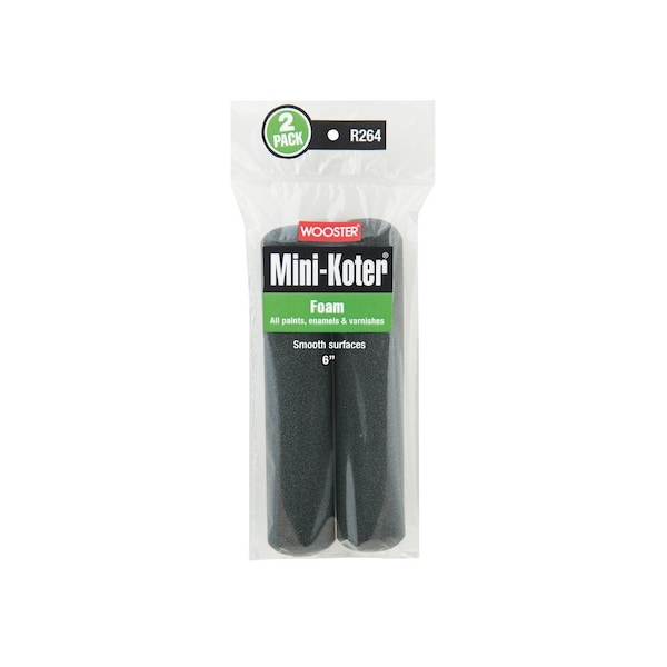 ROLLER PAINT MINI FOAM 6IN 2PK Specifications: Application: For painting behind radiators, bathrooms, closets, kitchens, pipes, tight areas and toilet tanks WOOSTER Mini Roller, 6 in L, Foam Cover, Surface Type: Smooth, Paint Type: All Paints, Enamels, Varnishes