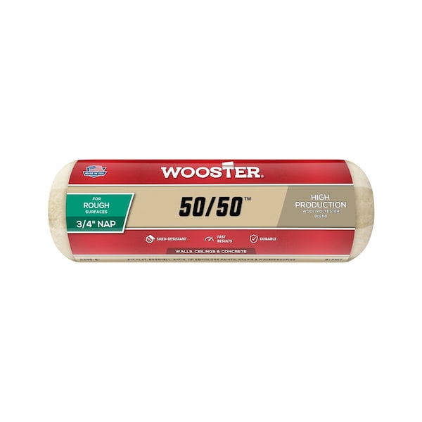Shed-resistant, cream-colored, knit fabric blend of 50% lambswool and 50% polyester for 100% performance in all flat, satin or semi-gloss paints, stains, waterproofing. Wool provides maximum paint capacity and a smooth finish; polyester resists matting. Green double-thick polypropylene core resists water, solvents, and cracking.