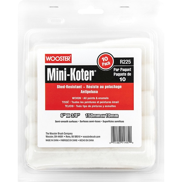 Mini Paint Roller Cover, Cover Type Mini, Surface Texture Semi-Smooth, Compatible Roller Frame Style Wire, 6 in Overall Length, 3/8 in Nap Size, Surface Material Drywall, Masonry, Metal, Wood, Paint Type All Paints, Core Diameter 1/4 in, Cover Material Woven Fabric, For Use With Rod Style Frames, Package Quantity 10