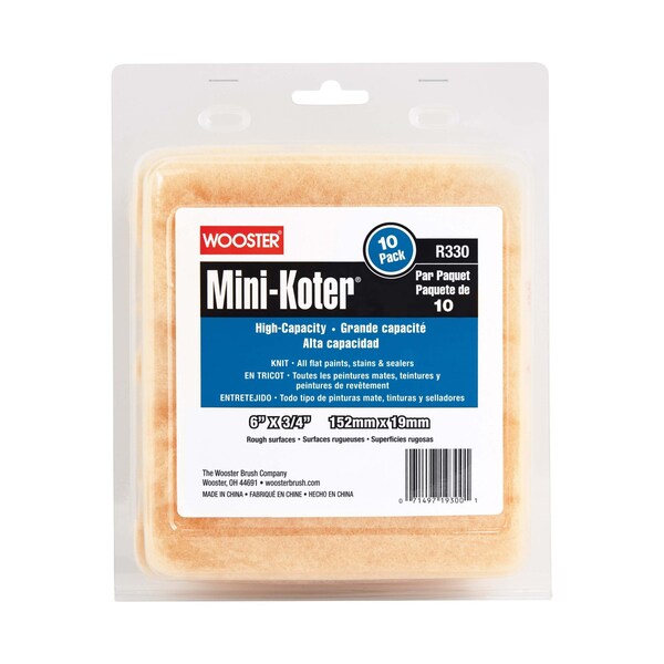 Paint Roller Cover, Cover Type Mini, Surface Texture Rough, Compatible Roller Frame Style Wire, 6 in Overall Length, 3/4 in Nap Size, Surface Material Brick, Masonry, Wood, Paint Type Flat Paints, Sealers, Stains, Core Diameter 1/4 in, Cover Material Knit Fabric, For Use With Flat Paints, Stains and Sealers, Includes (10) Mini Rollers, Package Quantity 10