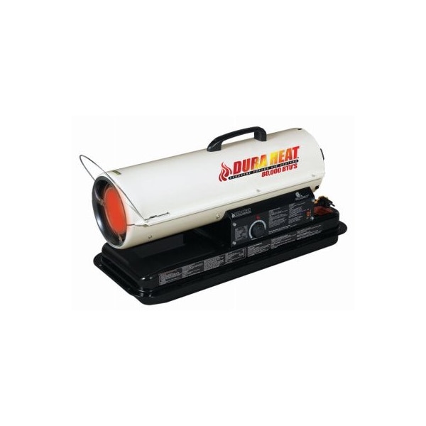 Duraheat, 80,000 BTU, Kerosene Portable Forced Air Heater, With TStat, Heats Up To 2,000 SQFT, 5 Gallon Fuel Tank, 265 CFM, Run Time Fuel Gauge, Auxiliary Power Outlet, OnOff Switch, Includes UL Listed Large Capacity Motors Fuse Protected Electrical Systems, All Components Securely Fasten Into Chassis To Insure Long Life, Utilizes Heavy Duty Spark Technology For In Field Endurance, MultiFuel Capable, Has Been Factory Tested To Operate With 1K Kerosene, 1 2 Fuel Oil Diesel, Jp8 JetA Fuels