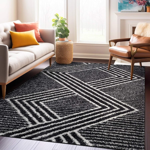 Modern, Contemporary style. Style your art-forward loft s with this Abstract Geometric Block Design shag rug featuring a cozy medium pile. The soft Abstract Geometric Block Design pattern adds inviting texture that families love. This version comes in deep Anthracite Dark Gray. It's Abstract Geometric Block Design design and medium pile provide a stylish yet cozy layer for living rooms, bedrooms, or play spaces. This rug brings directional style and edge and enhances depth with It's smoky gray tone, making it a versatile choice for modern households. Craft ed from 100% Polyester with a durable jute backing, It's kid and pet friendly, easy to clean, stain and fade resistant, and no shedding. Vacuum oft en, spot clean as needed, and rotate periodically for even wear. Durable Polyester Shag Construction - Made from 100% polyester with a sturdy jute backing, this medium-pile (0.57 in) shag rug is ideal for high-traffic spaces like living rooms, hallways, and entryways. OEKO-TEX certified and safe for family use. Use with a rug pad to prevent slipping and extend longevity. No-Shedding & Easy Maintenance - With a soft 0.57 in pile, this polyester shag rug is engineered to resist shedding, stains, and fading-making it low-maintenance and ideal for everyday messes. Spot clean or vacuum as needed. Soft & Pet/Kid Friendly - The plush medium pile offers a cozy feel underfoot while resisting messes and wear. Perfect for homes with children or pets, providing both comfort and durability. Please note: Colors may vary slightly due to monitor settings. Minor size and pattern variations are normal due to the manufacturing process.