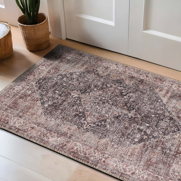 This washable charcoal medallion rug features faded ivory and dusty blue accents for a bold yet balanced vintage style. With a flat-pile surface and non-slip backing, It's a practical option for busy homes. Made from OEKO-TEX certified recycled materials, It's ideal for living rooms, bedrooms, or entryways. Rug ships folded; any creases will flatten naturally within a few days. Everyday-Ready Performance: Machine-washable and family-friendly, this rug is built for busy households. Ideal for high-traffic indoor areas like living rooms, bedrooms, nurseries, playrooms, dorms, and entryways. Kid- and pet-safe design delivers comfort and peace of mind. Flat Pile Comfort & Versatile Sizing: Craft ed from premium polyester fibers with a sleek flat pile that fIt's under doors and furniture. Lightweight, stain-resistant, and available in multiple sizes: 2 ft x 3 ft , 2 ft 6 in x 6 ft , 2 ft 6 in x 8 ft , 4 ft x 6 ft , 5 ft x 7 ft , 7 ft 7 in x 9 ft 6 in, 9 ft x 12 ft , and 10 ft x 14 ft . Effortless Care & Eco Design: Vacuum-friendly and easy to maintain with mild detergent or machine wash. Made using OEKO-TEX certified recycled materials and a non-slip backing for added safety and sustainability in everyday use. Shipped folded in a box or bag - creases will flatten naturally within a few days. Please Note: Digital images and product dimensions are as accurate as possible, but slight variations may occur due to differences in computer monitors. Lengths and widths may vary, and patterns may differ slightly based on the shape and size selected. Vacuum regularly without a beater bar to maintain surface texture. For deep cleaning, machine wash cold on a gentle cycle. Do not use bleach. Line dry only. For stubborn stains, professional cleaning is recommended. Note: Larger sizes (e. g., 7 ft 7 in x 9 ft 6 in and up) may require a commercial-sized washing machine. Slight shrinkage (1-2 inches) may occur aft er the first wash.