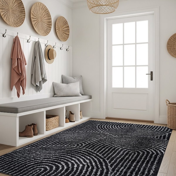 Bohemian, Contemporary style. Style your bold accent spaces with this Concentric Circle shag rug featuring a cozy medium pile. The soft Concentric Circle pattern adds inviting texture that families love. This version comes in deep Anthracite Dark Gray. It's Concentric Circle design and medium pile provide a stylish yet cozy layer for living rooms, bedrooms, or play spaces. This rug introduces bold, zigzag movement and enhances depth with It's smoky gray tone, making it a versatile choice for modern households. Craft ed from 100% Polyester with a durable jute backing, It's kid and pet friendly, easy to clean, stain and fade resistant, and no shedding. Vacuum oft en, spot clean as needed, and rotate periodically for even wear. Durable Polyester Shag Construction - Made from 100% polyester with a sturdy jute backing, this medium-pile (0.57 in) shag rug is ideal for high-traffic spaces like living rooms, hallways, and entryways. OEKO-TEX certified and safe for family use. Use with a rug pad to prevent slipping and extend longevity. No-Shedding & Easy Maintenance - With a soft 0.57 in pile, this polyester shag rug is engineered to resist shedding, stains, and fading-making it low-maintenance and ideal for everyday messes. Spot clean or vacuum as needed. Soft & Pet/Kid Friendly - The plush medium pile offers a cozy feel underfoot while resisting messes and wear. Perfect for homes with children or pets, providing both comfort and durability. Please note: Colors may vary slightly due to monitor settings. Minor size and pattern variations are normal due to the manufacturing process.