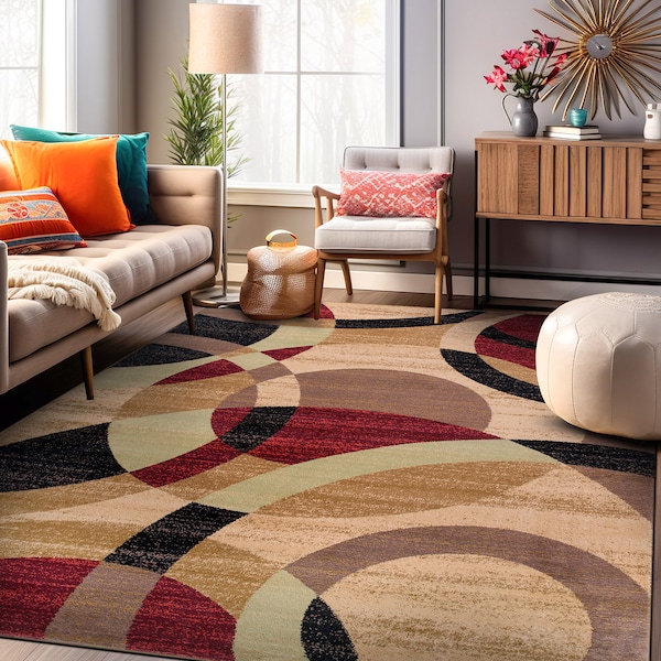 Contemporary Abstract Circles Area Rug in blue is a fusion of artistic flair and functionality. This elegant rug, featuring a contemporary circular pattern in a beautiful blue shade, is destined to be the centerpiece of any room. Its variety of sizes, including 2x3, 2x7 runners, 3x5, 5x8, 6' round, 6x9, 8x10, 9x12, and 10x14, ensures a suitable fit for any indoor space. Made from premium polypropylene and backed with sturdy jute, the rug offers a luxurious feel underfoot and remarkable durability, making it perfect for high-traffic areas. The rich blue color combined with its heavy, dense pile and intricate surface texture makes it not only a visually appealing addition to your decor but also a practical choice for maintaining elegance in busy households.