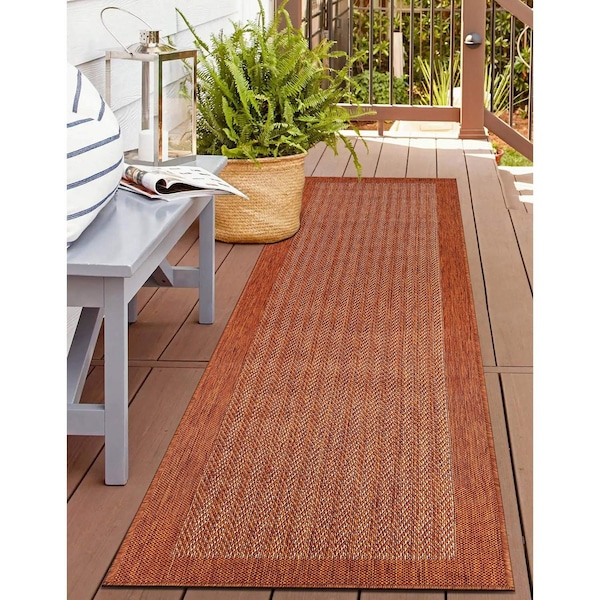 Contemporary Bordered Weather Resistant Reversible Indoor/Outdoor Rug 2 ft x 7 ft Rust