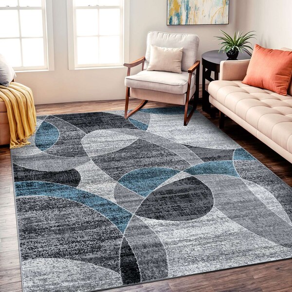 Explore the pinnacle of comfort and style with our contemporary abstract circles area rug featuring shades of blue, gray, black, and ivory. With It's lavish 0.39-inch pile height, this abstract rug provides a velvety soft ness that envelops any space in cozy comfort. Effortless upkeep, as it effortlessly withstands spot cleaning and vacuuming. Meticulously craft ed from premium polypropylene and fortified with a sturdy jute backing, this rug epitomizes enduring charm and durability. Exceptional Durability: Craft ed to endure daily wear and tear, our area rug is an ideal choice for high-traffic areas throughout your home. Safe for Kids and Pets: This rug provides a safe and comfortable flooring option for various areas in your home, including the living room, dining room, bedroom, entryway, nursery, kids room, playroom, dorm room, study, or home office. Sturdy Jute Backing: Our rug boasts a dependable jute backing that enhances It's stability and overall quality. Longevity and Safety Assurance: To enhance both the longevity and safety of your rug, we recommend using a rug pad underneath. This prevents unwanted shift ing and sliding, ensuring you enjoy your rug for years to come. Machine-Woven Comfort: Skillfully craft ed using advanced weaving technology, our rugs strike the perfect balance between plush comfort and enduring quality for any room. Versatile Sizing Options: Available in a range of sizes to ensure the perfect fit for any space in your home. Low-Maintenance Luxury: Enjoy the beauty of our rug with minimal effort. Regular vacuuming and simple spot cleaning with mild detergent are all it takes to maintain It's pristine appearance. Please note: While we strive to provide accurate digital images and product dimensions, please be aware that there may be slight variations in rug colors due to differences in computer monitors. Additionally, lengths and widths may slightly differ from the published dimensions. We make every effort to provide precise measurements, but please understand that some variation is possible. Furthermore, patterns may exhibit slight variations based on the shape and size chosen. Spot clean with a solution of mild detergent and water or clean professionally. Regular vacuuming help rugs remain attractive and serviceable.