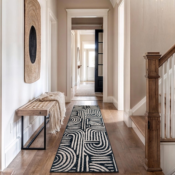 Elevate your decor with this modern geometric area rug, where crisp lines and high-contrast black and ivory hues fuse to create a timeless statement piece. Thoughtfully crafted with a 0.39-inch pile height, it slips easily beneath furniture and stands up to heavy foot traffic. The durable, easy-care materials resist stains and shedding, making regular maintenance a breeze. Whether your style is minimalist or eclectic, this rug adds a layer of sophistication and practicality to any room in your home. Durability & Safety: Designed for long-lasting durability, this rug is a reliable choice for high-traffic spaces throughout your home. Crafted from safe, non-toxic materials, it provides a comfortable and secure surface for kids and pets. The sturdy jute backing enhances stability and longevity, ensuring years of dependable use. To prevent shifting and extend the life of your rug, we recommend using a rug pad for added safety and comfort. Comfort & Convenience: Expertly machine-woven using advanced technology, this rug offers the perfect balance of softness and durability. Its versatile design makes it an excellent addition to any room, effortlessly complementing various home decor styles. Available in a range of sizes, it fits seamlessly into different spaces. Designed for effortless maintenance, it requires only regular vacuuming and simple spot cleaning with mild detergent to maintain its beauty. Please note: While we strive for accuracy in our digital images, actual rug colors may vary slightly due to monitor settings. Minor variations in length and width may occur due to the manufacturing process, and patterns may adjust slightly depending on the selected size and shape. Spot clean with a solution of mild detergent and water or clean professionally. Regular vacuuming help rugs remain attractive and serviceable.