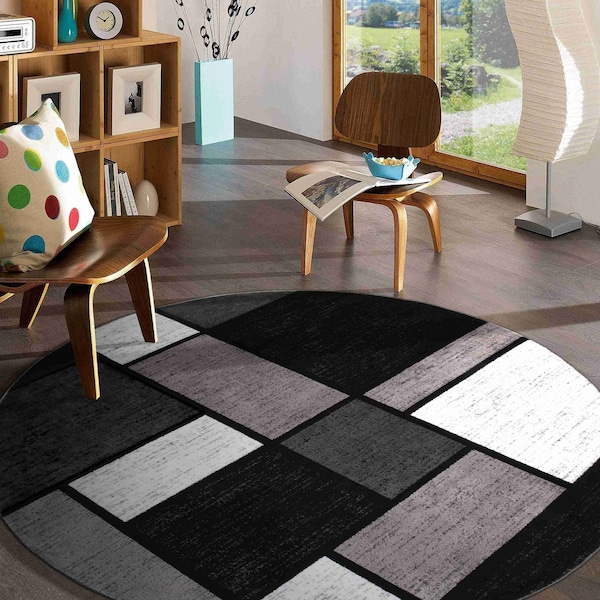 Contemporary Modern Boxes Design Soft Area Rug 8 ft Round Gray