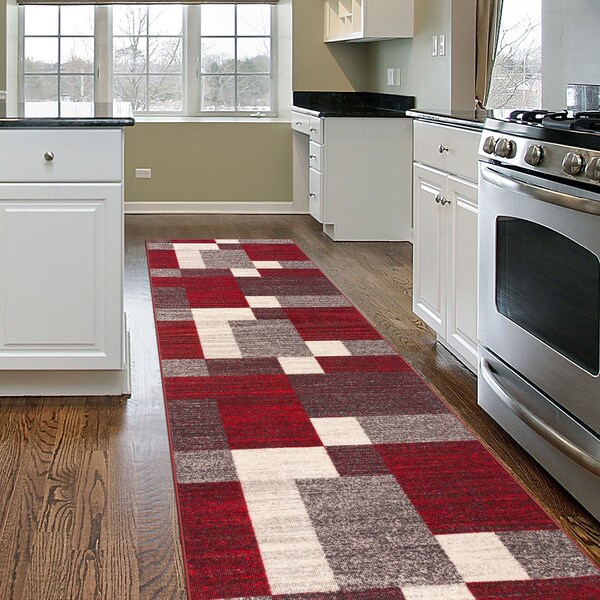 Contemporary Modern Geometric Boxes Design Non-Slip Runner Rug 2' x 7' Red