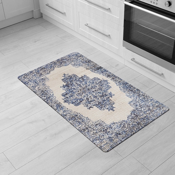 Distressed Medallion Cushioned Anti Fatigue Standing Kitchen Mat 18 ft x 30 ft Blue