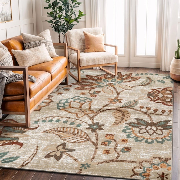 Add a splash of color and nature-inspired beauty to your home with this beige floral area rug. Large-scale blossoms and leafy accents in teal, rust, and brown create an artistic, welcoming feel. Made from durable polypropylene and backed with jute, this rug is built for long-lasting softness and easy upkeep. Its low 0.39-inch pile is perfect for busy households, offering both charm and practicality for any room from the entryway to the family room. Durability & Safety: Designed for long-lasting durability, this rug is a reliable choice for high-traffic spaces throughout your home. Crafted from safe, non-toxic materials, it provides a comfortable and secure surface for kids and pets. The sturdy jute backing enhances stability and longevity, ensuring years of dependable use. To prevent shifting and extend the life of your rug, we recommend using a rug pad for added safety and comfort. Comfort & Convenience: Expertly machine-woven using advanced technology, this rug offers the perfect balance of softness and durability. Its versatile design makes it an excellent addition to any room, effortlessly complementing various home decor styles. Available in a range of sizes, it fits seamlessly into different spaces. Designed for effortless maintenance, it requires only regular vacuuming and simple spot cleaning with mild detergent to maintain its beauty. Please note: While we strive for accuracy in our digital images, actual rug colors may vary slightly due to monitor settings. Minor variations in length and width may occur due to the manufacturing process, and patterns may adjust slightly depending on the selected size and shape. Spot clean with a solution of mild detergent and water or clean professionally. Regular vacuuming help rugs remain attractive and serviceable.