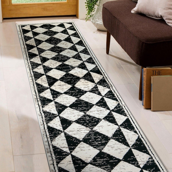 Elevate your decor with this modern geometric area rug, where crisp lines and high-contrast black and ivory hues fuse to create a timeless statement piece. Thoughtfully crafted with a 0.39-inch pile height, it slips easily beneath furniture and stands up to heavy foot traffic. The durable, easy-care materials resist stains and shedding, making regular maintenance a breeze. Whether your style is minimalist or eclectic, this rug adds a layer of sophistication and practicality to any room in your home. Durability & Safety: Designed for long-lasting durability, this rug is a reliable choice for high-traffic spaces throughout your home. Crafted from safe, non-toxic materials, it provides a comfortable and secure surface for kids and pets. The sturdy jute backing enhances stability and longevity, ensuring years of dependable use. To prevent shifting and extend the life of your rug, we recommend using a rug pad for added safety and comfort. Comfort & Convenience: Expertly machine-woven using advanced technology, this rug offers the perfect balance of softness and durability. Its versatile design makes it an excellent addition to any room, effortlessly complementing various home decor styles. Available in a range of sizes, it fits seamlessly into different spaces. Designed for effortless maintenance, it requires only regular vacuuming and simple spot cleaning with mild detergent to maintain its beauty. Please note: While we strive for accuracy in our digital images, actual rug colors may vary slightly due to monitor settings. Minor variations in length and width may occur due to the manufacturing process, and patterns may adjust slightly depending on the selected size and shape. Spot clean with a solution of mild detergent and water or clean professionally. Regular vacuuming help rugs remain attractive and serviceable.