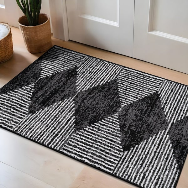 Ground your space with this bold black and ivory area rug featuring a modern geometric pattern of stacked diamonds and directional stripes. The contrasting tones and clean lines offer visual interest without overwhelming your space. Crafted from 100% polypropylene and backed with jute, this rug is durable, soft, and easy to clean. The low 0.39" pile height makes it perfect for everyday living in high-traffic rooms. Durability & Safety: Designed for long-lasting durability, this rug is a reliable choice for high-traffic spaces throughout your home. Crafted from safe, non-toxic materials, it provides a comfortable and secure surface for kids and pets. The sturdy jute backing enhances stability and longevity, ensuring years of dependable use. To prevent shifting and extend the life of your rug, we recommend using a rug pad for added safety and comfort. Comfort & Convenience: Expertly machine-woven using advanced technology, this rug offers the perfect balance of softness and durability. Its versatile design makes it an excellent addition to any room, effortlessly complementing various home decor styles. Available in a range of sizes, it fits seamlessly into different spaces. Designed for effortless maintenance, it requires only regular vacuuming and simple spot cleaning with mild detergent to maintain its beauty. Please note: While we strive for accuracy in our digital images, actual rug colors may vary slightly due to monitor settings. Minor variations in length and width may occur due to the manufacturing process, and patterns may adjust slightly depending on the selected size and shape. Spot clean with a solution of mild detergent and water or clean professionally. Regular vacuuming help rugs remain attractive and serviceable.