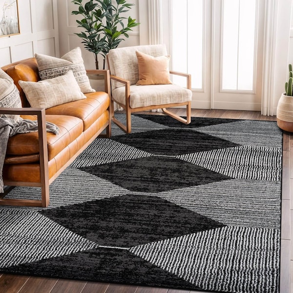 Ground your space with this bold black and ivory area rug featuring a modern geometric pattern of stacked diamonds and directional stripes. The contrasting tones and clean lines offer visual interest without overwhelming your space. Crafted from 100% polypropylene and backed with jute, this rug is durable, soft, and easy to clean. The low 0.39" pile height makes it perfect for everyday living in high-traffic rooms. Durability & Safety: Designed for long-lasting durability, this rug is a reliable choice for high-traffic spaces throughout your home. Crafted from safe, non-toxic materials, it provides a comfortable and secure surface for kids and pets. The sturdy jute backing enhances stability and longevity, ensuring years of dependable use. To prevent shifting and extend the life of your rug, we recommend using a rug pad for added safety and comfort. Comfort & Convenience: Expertly machine-woven using advanced technology, this rug offers the perfect balance of softness and durability. Its versatile design makes it an excellent addition to any room, effortlessly complementing various home decor styles. Available in a range of sizes, it fits seamlessly into different spaces. Designed for effortless maintenance, it requires only regular vacuuming and simple spot cleaning with mild detergent to maintain its beauty. Please note: While we strive for accuracy in our digital images, actual rug colors may vary slightly due to monitor settings. Minor variations in length and width may occur due to the manufacturing process, and patterns may adjust slightly depending on the selected size and shape. Spot clean with a solution of mild detergent and water or clean professionally. Regular vacuuming help rugs remain attractive and serviceable.