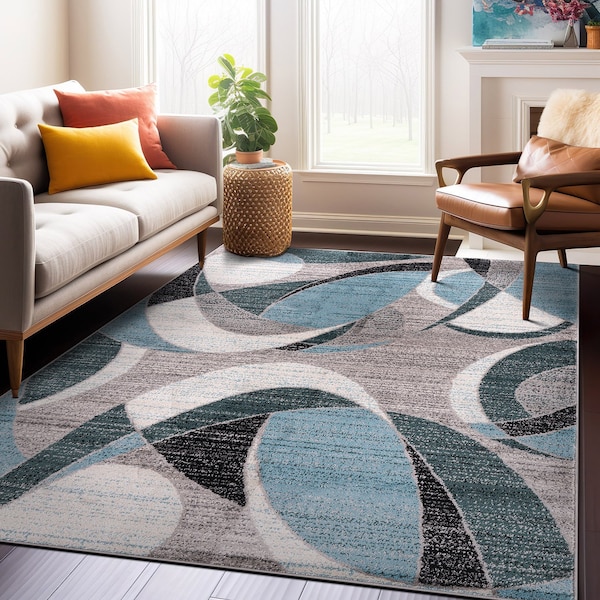 Revamp your home decor with our modern circles abstract area rug, featuring captivating shades of blue, gray, black, and ivory. It strikes the perfect balance between comfort and contemporary sophistication, transforming any room into a stylish haven. Enjoy a plush 0.39-inch pile height that delivers a luxurious underfoot experience, and rest easy knowing that maintenance is a breeze with easy spot cleaning and vacuuming. Meticulously crafted from high-quality polypropylene fabric and complemented by a robust jute backing, this rug ensures both endurance and timeless aesthetic appeal. Redefine your living space with this exceptional rug that epitomizes modern comfort and style.