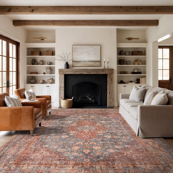 This machine-washable medallion rug combines warm beige, terracotta, and navy tones for a vibrant, lived-in look. The flat-pile surface fIt's easily under doors and furniture, while the non-slip backing keeps it securely in place. Made from OEKO-TEX certified recycled materials, It's a practical, eco-conscious choice for high-traffic family areas like living rooms, bedrooms, playrooms, or home offices. Rug ships folded; any creases will flatten naturally within a few days. Everyday-Ready Performance: Machine-washable and family-friendly, this rug is built for busy households. Ideal for high-traffic indoor areas like living rooms, bedrooms, nurseries, playrooms, dorms, and entryways. Kid- and pet-safe design delivers comfort and peace of mind. Flat Pile Comfort & Versatile Sizing: Craft ed from premium polyester fibers with a sleek flat pile that fIt's under doors and furniture. Lightweight, stain-resistant, and available in multiple sizes: 2 ft x 3 ft , 2 ft 6 in x 6 ft , 2 ft 6 in x 8 ft , 4 ft x 6 ft , 5 ft x 7 ft , 7 ft 7 in x 9 ft 6 in, 9 ft x 12 ft , and 10 ft x 14 ft . Effortless Care & Eco Design: Vacuum-friendly and easy to maintain with mild detergent or machine wash. Made using OEKO-TEX certified recycled materials and a non-slip backing for added safety and sustainability in everyday use. Shipped folded in a box or bag - creases will flatten naturally within a few days. Please Note: Digital images and product dimensions are as accurate as possible, but slight variations may occur due to differences in computer monitors. Lengths and widths may vary, and patterns may differ slightly based on the shape and size selected. Vacuum regularly without a beater bar to maintain surface texture. For deep cleaning, machine wash cold on a gentle cycle. Do not use bleach. Line dry only. For stubborn stains, professional cleaning is recommended. Note: Larger sizes (e. g., 7 ft 7 in x 9 ft 6 in and up) may require a commercial-sized washing machine. Slight shrinkage (1-2 inches) may occur aft er the first wash.